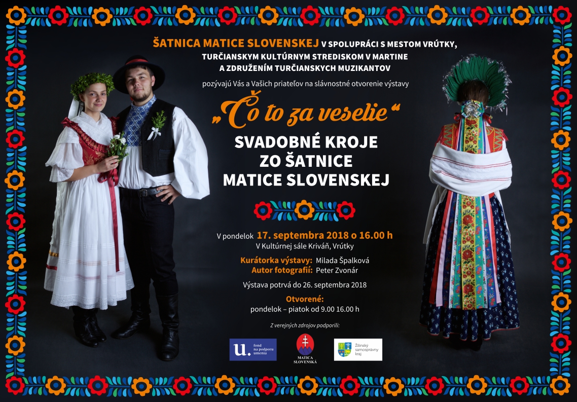 Najkrajšie svadobné kroje zo Šatnice Matice slovenskej vyniknú na pripravovanej výstave s názvom „Čo to za veselie“ vo Vrútkach. Organizátori výstavy sa inšpirovali známou svadobnou ľudovou piesňou s rovnomenným názvom.